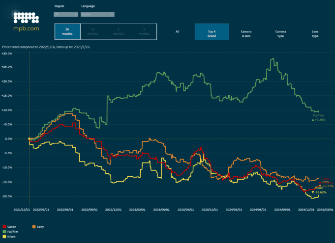 In terms of brands, from what I can tell over the last 36 months according to MPB data has only Fujifilm net positive in terms of pricing (+ 9%). Other major camera manufacturers over that same time period land in the red as you might expect: Nikon (-20%); Canon (-16%); Sony (-14%).