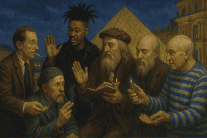 Duchamp offers cigarettes. Van Gogh accepts eagerly. Basquiat declines with a laugh. “Man, even your cigarettes are readymades.”